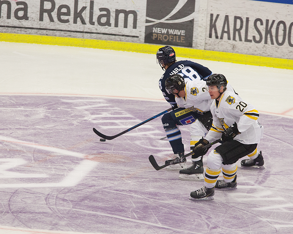 Men sammantaget en av de sämre insatserna från BIK hittills under säsongen. Slarviga passningar, tama avslut, dåligt pucktempo och lite krampaktigt… annars hade man rett ut detta ändå. Glädjeämnet för kvällen var väl Jonathan Harju som äntligen fick hänga in en puck och välförtjänt utsågs till bäste spelare i hemmalaget. Kunde mycket väl ha satt ytterligare en i tredje perioden efter en fin insats. Annars vill jag påstå att alla kan bättre. Ska man vara riktigt kritisk så tycker jag att Olle Eriksson Ek nog borde ha tagit i alla fall ett, kanske två av målen, men å andra sidan svarade han för några fina räddningar också, så man ska inte vara alltför gnällig. Men… några spelare verkar just nu ha kört fast lite, och jag tycker lite synd om Victor Ekarv som totalt verkar sakna självförtroende och som kastas mellan olika formationer hit och dit utan kontinuitet.